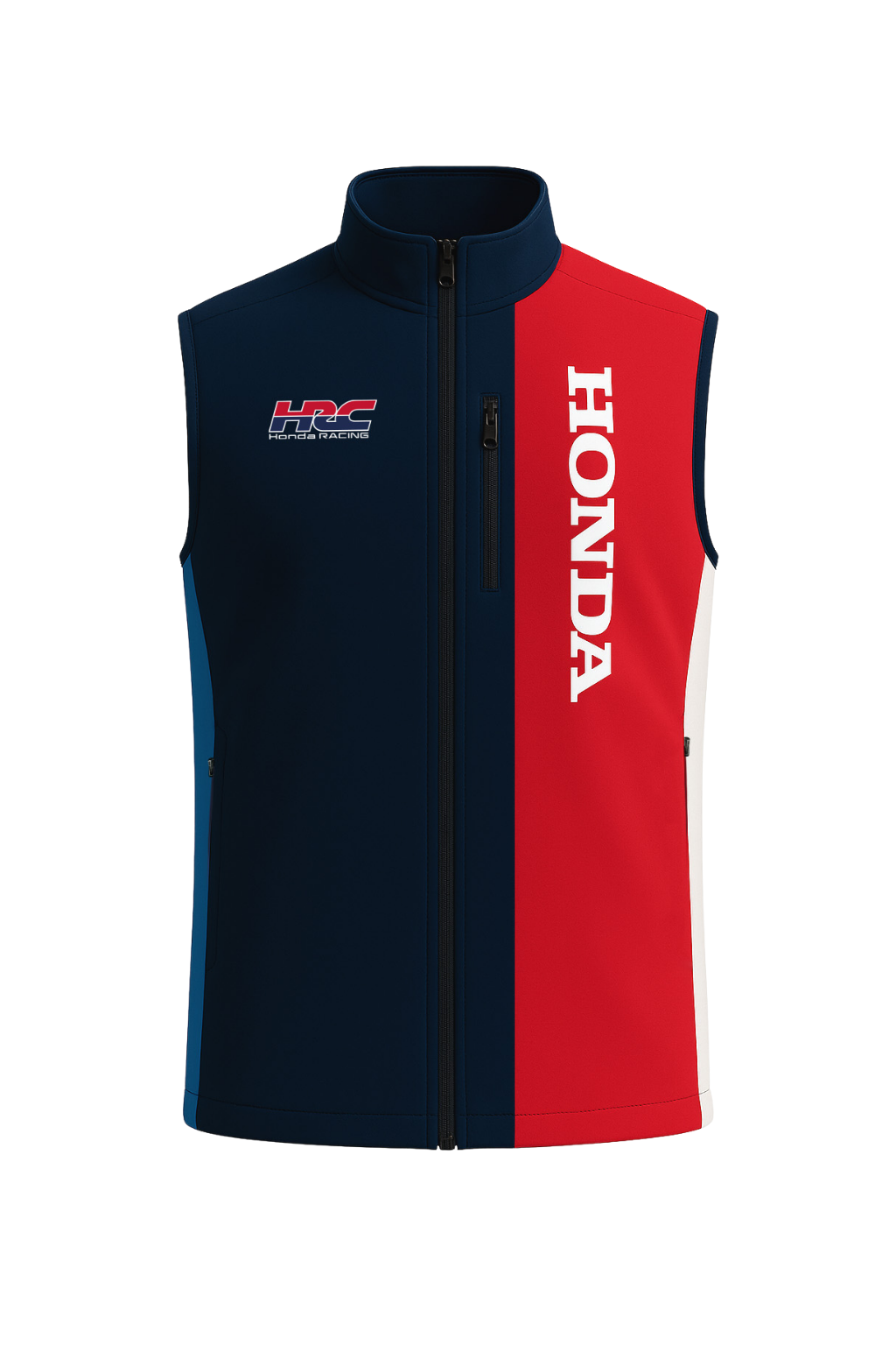 HRC vest in high-quality technical fabric, designed to ensure flexibility and ease of movement. The chromatic play in red and blue is highlighted by the vertical HONDA dtf anti sublimation print and the HRC logo on the chest, while the Honda logo on the back completes the piece with an iconic signature. A distinctive garment that blends refined aesthetics with performance, as it features all the official Honda HRC team branding and details.