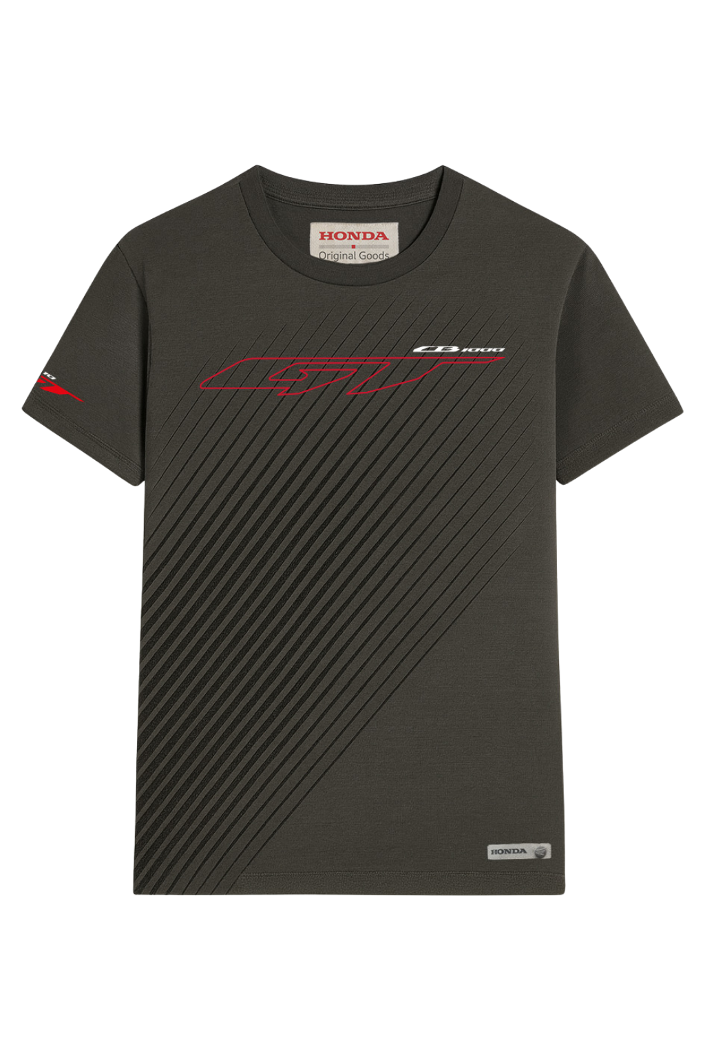 CB1000GT T-shirt made of 100% combed cotton jersey with a peach hand finish for a soft and refined touch. featuring a modern design with diagonal tone-on-tone graphics. The front showcases the stylized “GT 1000” logo in red and white, while the back is finished with the red Honda Wing logo below the collar. A statement piece that captures the spirit of exploration and off-road freedom.