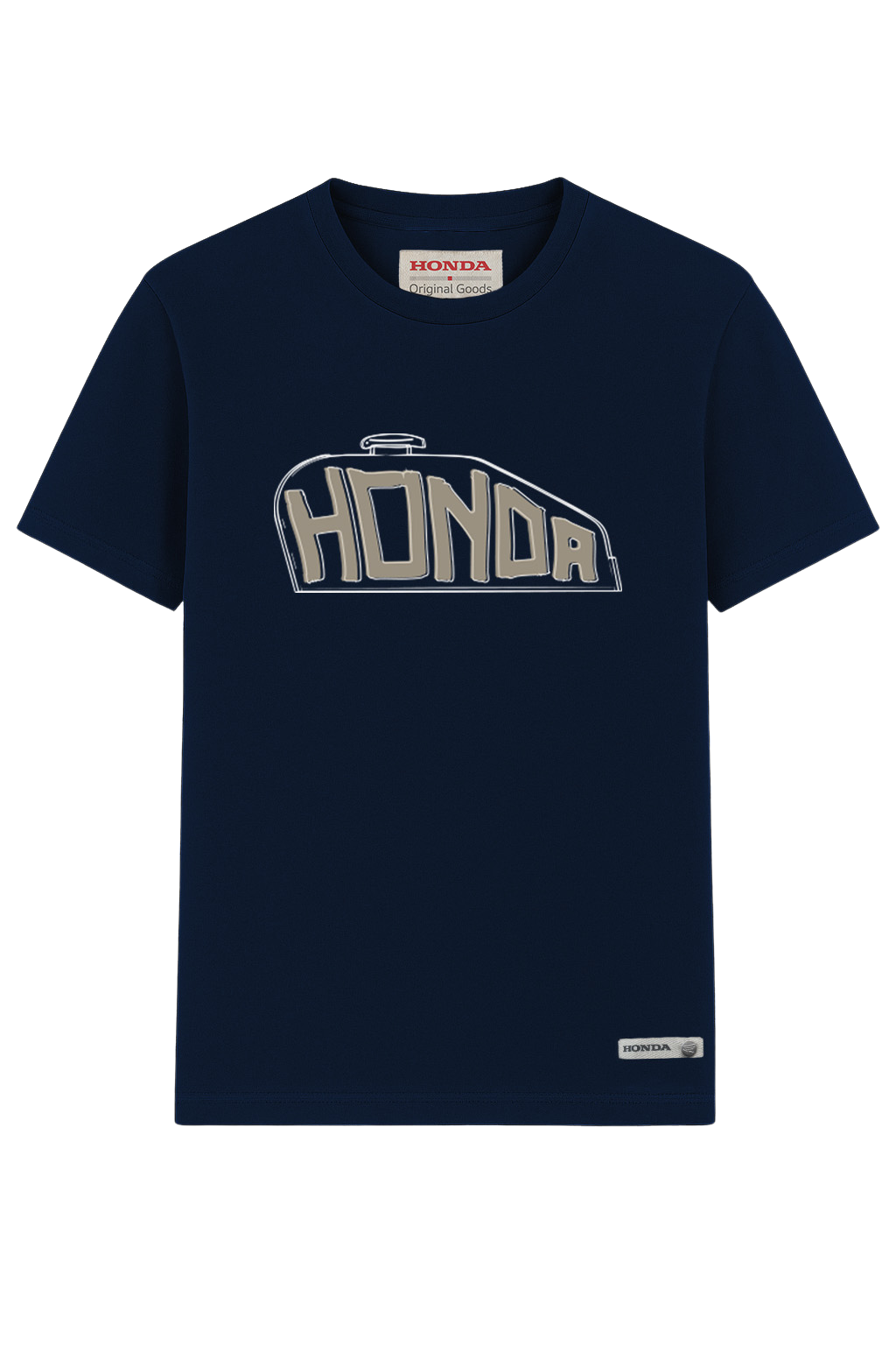 Honda tank T-shirt made of 100% combed cotton with a peach hand finish for a smooth and soft touch. Presented in navy blue, the front is highlighted by the bold tank graphic with contrasting Honda lettering, blending vintage inspiration with a fresh, urban vibe. Urban Fun is effortless comfort with a playful Honda spirit for everyday style.