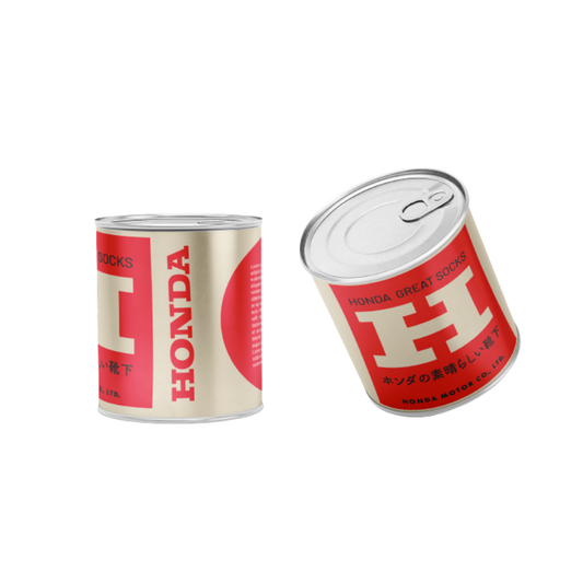White crew socks with bold red Honda lettering and Japanese script, finished with double stripes at the toe. Packaged in a unique collectible can, they bring style and fun to...