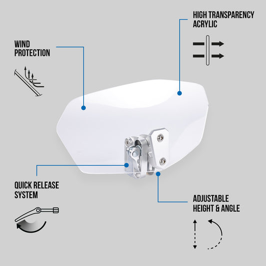 Oxford Windshield - Clear 260 X 125mm The Oxford Windshield is an acrylic visor which clips onto the main screen of the motorcycle and redirects airflow away from the rider...