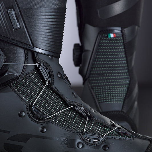 Dainese Freeland 2 - GORE-TEX Boots - Black 001 DESCRIPTION Four-season motorcycle boots with Gore-Tex® waterproof membrane, perforated fabric and large stretch panels.