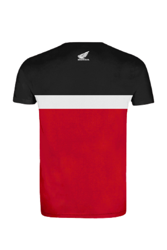100% cotton jersey, 150 gsm Printed logo and chest and back under the neck Herringbone red neck tape Metal rivet with embossed Honda logo Herringbone printed label on inside neck...