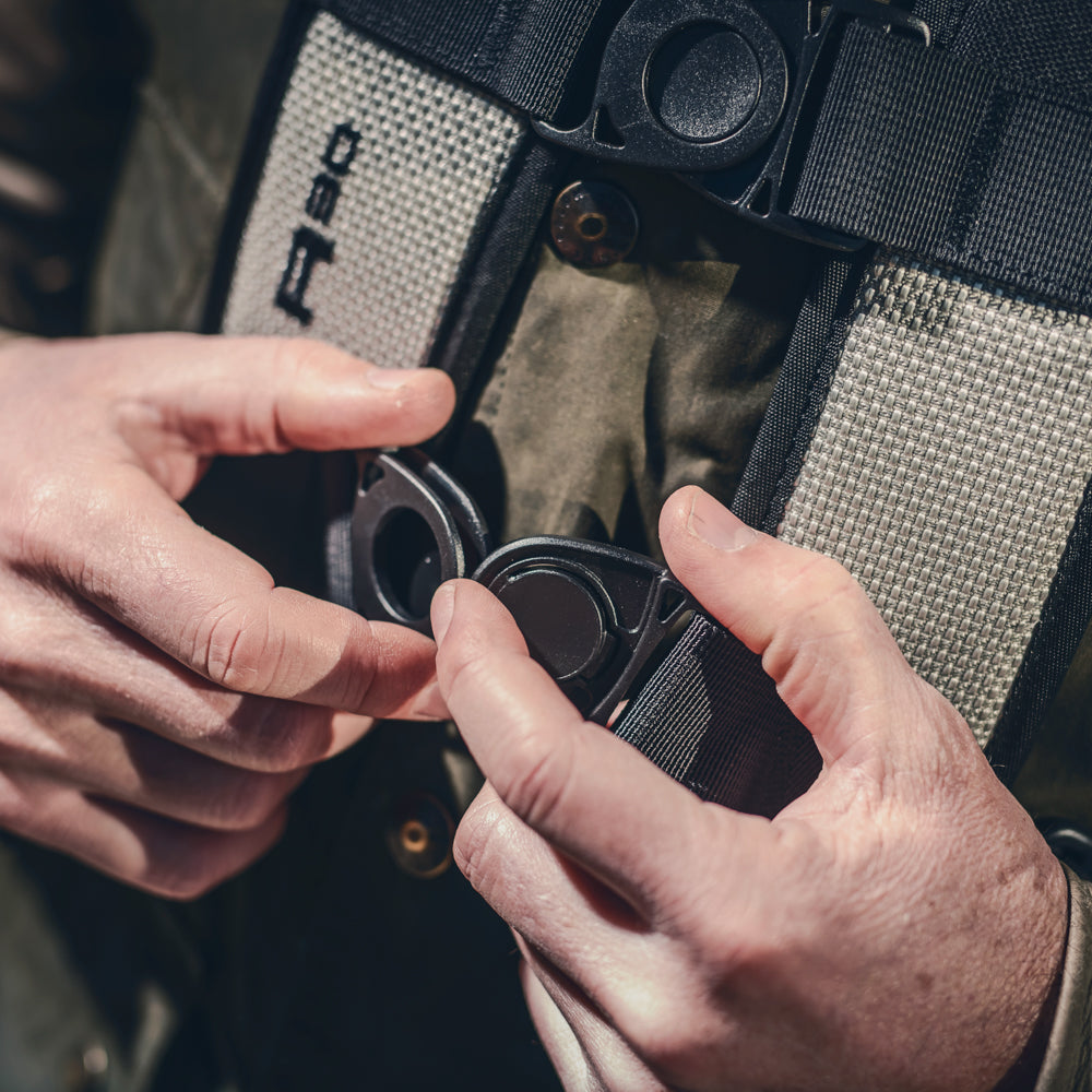 Kriega’s signature alloy adjusters set the waist tension in seconds and eradicate loose strap ends, giving a clean, uncluttered harness design.